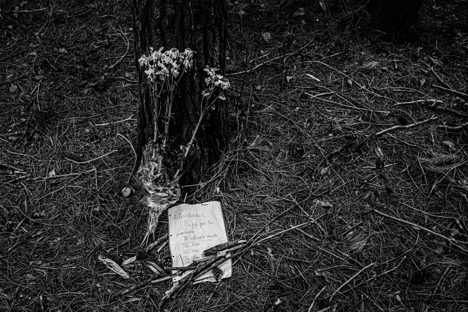 Walking with my dog, I found this in the country, not far from some apartments buildings. At the foot of a tree, a bouquet of flowers, a candle (at the left side) and a paper with a text writen with pen.